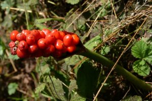 Die Fruchtkörper des Aronstabs (Arum maculatum) bieten eindrucksvolle Bilder am Rand der dortigen Waldwege. Der Aronstab wächst vor allem in hochwertigen Laubmischwäldern mit großer Naturnähe. Seinen Namen verdankt der Aronstab der biblischen Figur des Aaron, dessen Stab als Zeichen seiner Auserwählung zum Hohepriester ergrünte. Die Bestäubung erfolgt durch Insekten, sodass das dortige Vorkommen des Aronstabs durchaus auch als ein Indikator für ein intaktes Insektenleben gelten kann. Der Aronstab sollte somit nur angeschaut werden, da alle Pflanzenteile giftig sind ( Oxalat, Saponin, Aroin, Coniin ).